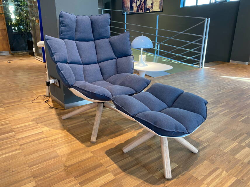 - Schale weiß, Bezug Stoff Lari Farbe navy blau, Gestell Eiche hell gebürstet