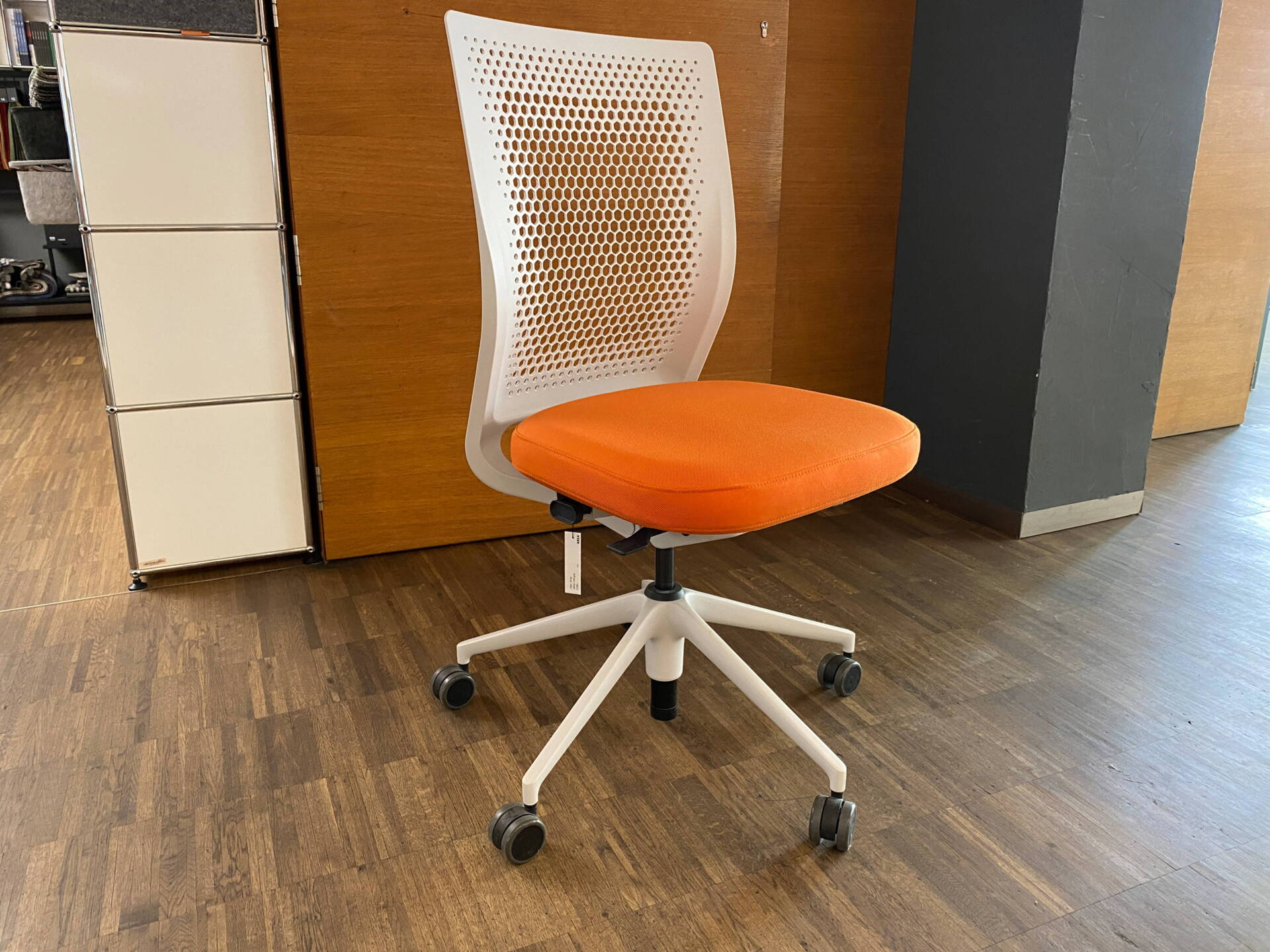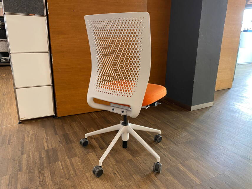 - Bezug Stoff Reflect Farbe safran, Rahmen soft grey, 5-Stern Alu Gestell, FlowMotion Mechanik mit Vorwärtsneigung und Sitztiefenverstellung